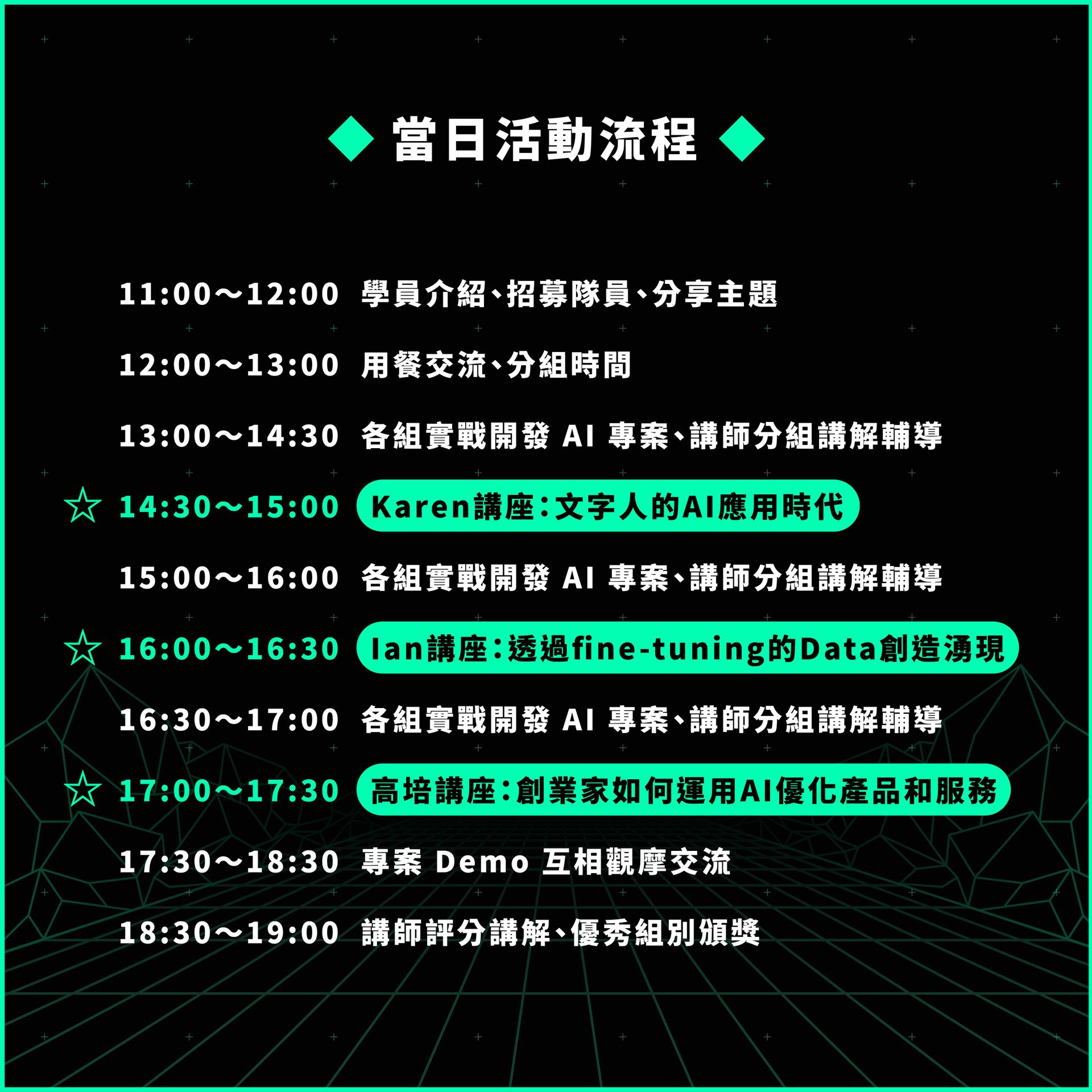 本活動延伸自 AI 交流讀書會,我們鼓勵學員在瞭解新知之餘,也能實際動手創造新的產品與服務,累積自己的實戰經驗與作品集,同時拓展能夠一起鑽研的同好人脈。歡迎對 AI 技術有興趣,也想挑戰自我的學員一同激發好點子,發掘產業痛點,利用 AI 創造各行各業的解決方案。表現優秀的隊伍將有機會獲得獎金,若參加人數超過 30 人,預計頒發: