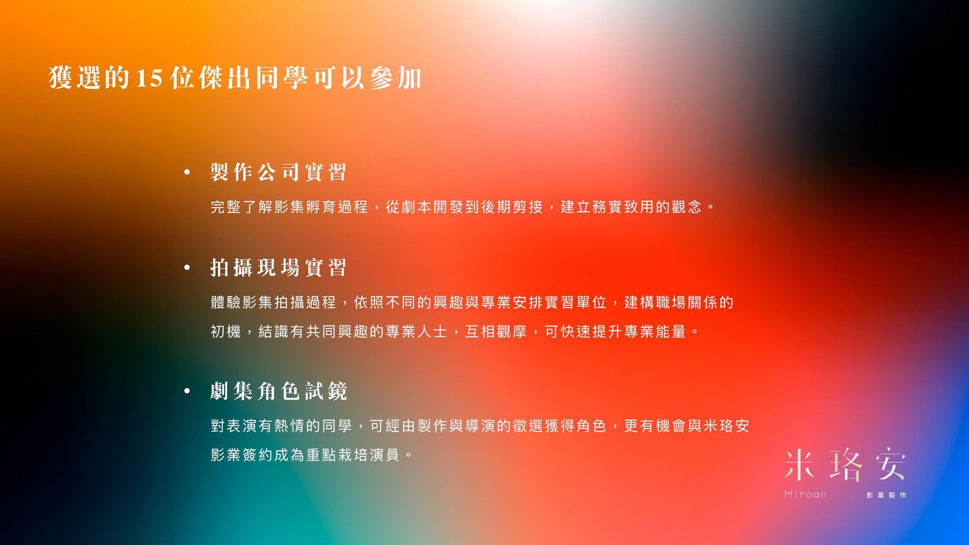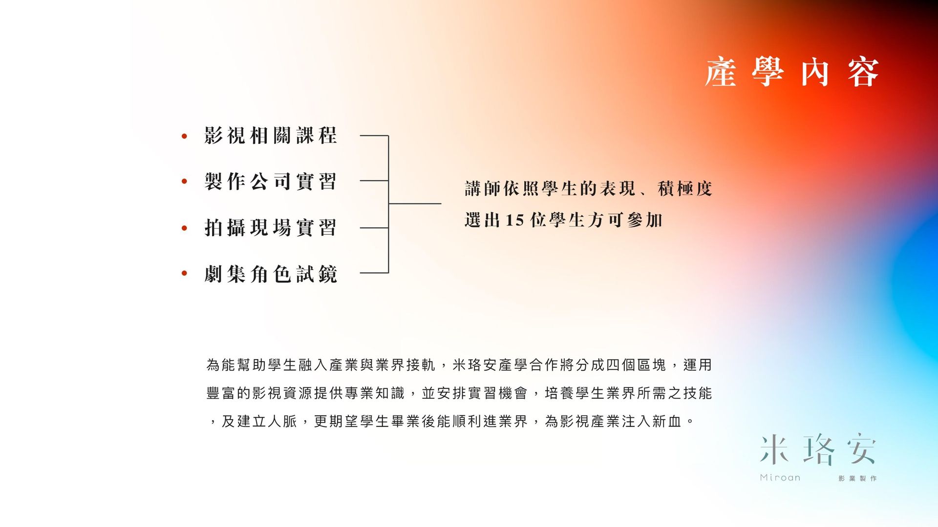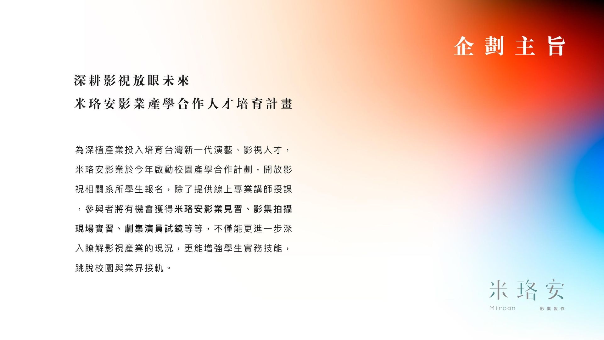為深植產業投入培育台灣新一代演藝、影視人才,米珞安影業於今年啟動產學計劃,開放對影視有興趣的朋友前來報名參加,除了提供線上專業講師授課,參與者將有機會獲得米珞安影業見習、影集拍攝現場實習、劇集演員試鏡等等,不僅能更進一步深入瞭解影視產業的現況,更能增強實務技能與業界接軌。