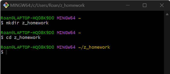 打開 Git Bash,以"mkdir 資料夾名稱" 創建母資料夾、"cd 資料夾名稱" 前往資料夾的位置。以下為例,創建了一個叫做 z_homework 的資料夾並前往該資料夾。以後如果參加許多學院的開發班,都可以把每個開發班的資料夾集中放在 z_homework 母資料中當成學院作品集。