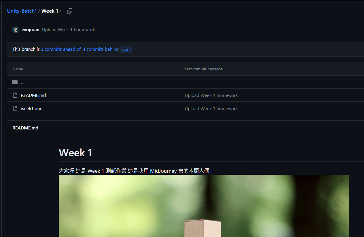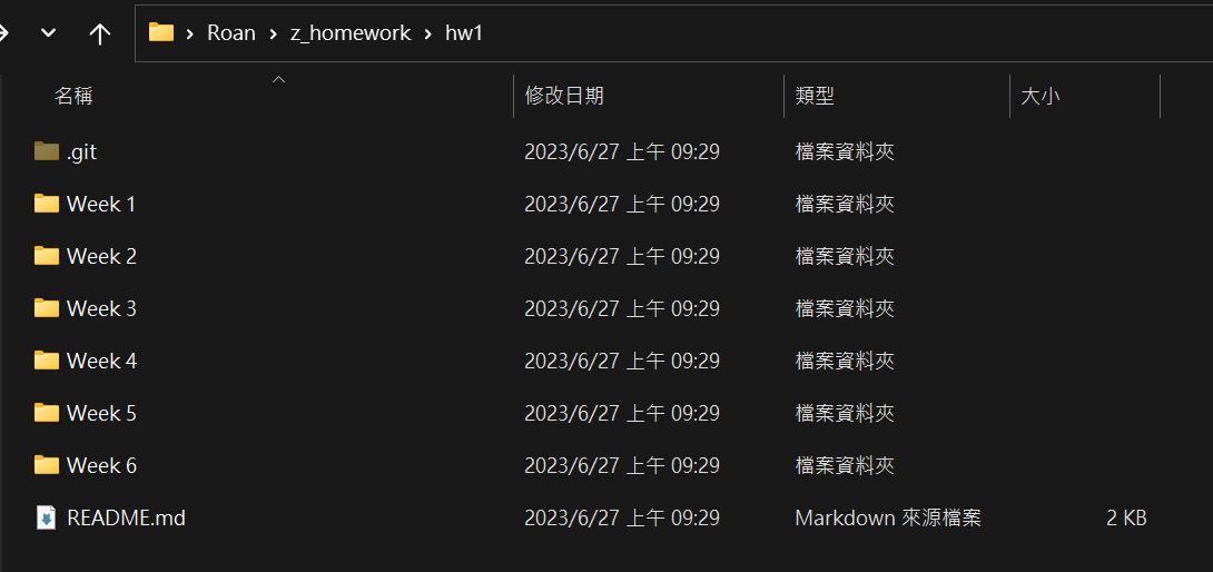 假設 Week 1 作業是畫一張圖,畫好後放到 hw1 / Week 1 資料夾,並修改 readme 說明
